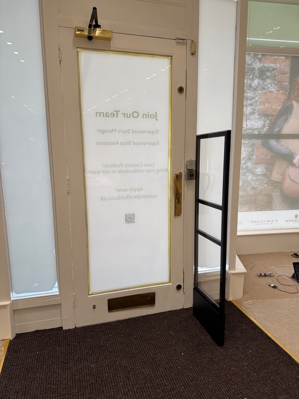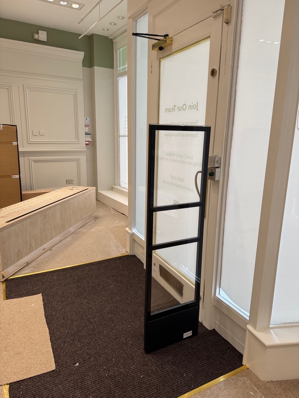 Because the store features a single wooden door, we were able to install one pedestal on the door handle side, achieving full coverage without obstructing customer flow.